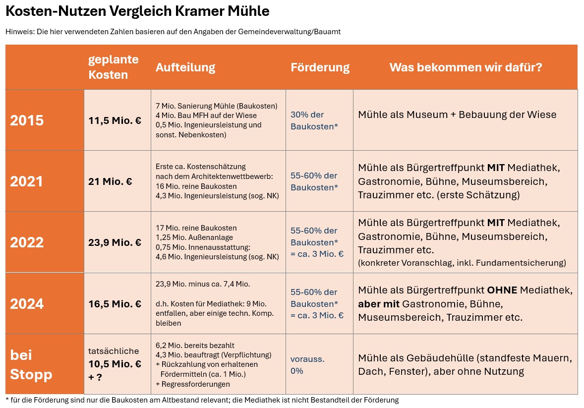 - Kostenschätzung 2015: Gesamtkosten Mühle ca. 11 Mio., aber: einfache Sanierung, Nutzung als Museum und Bebauung der Mühlenwiese mit einem Mehrfamilienblock.